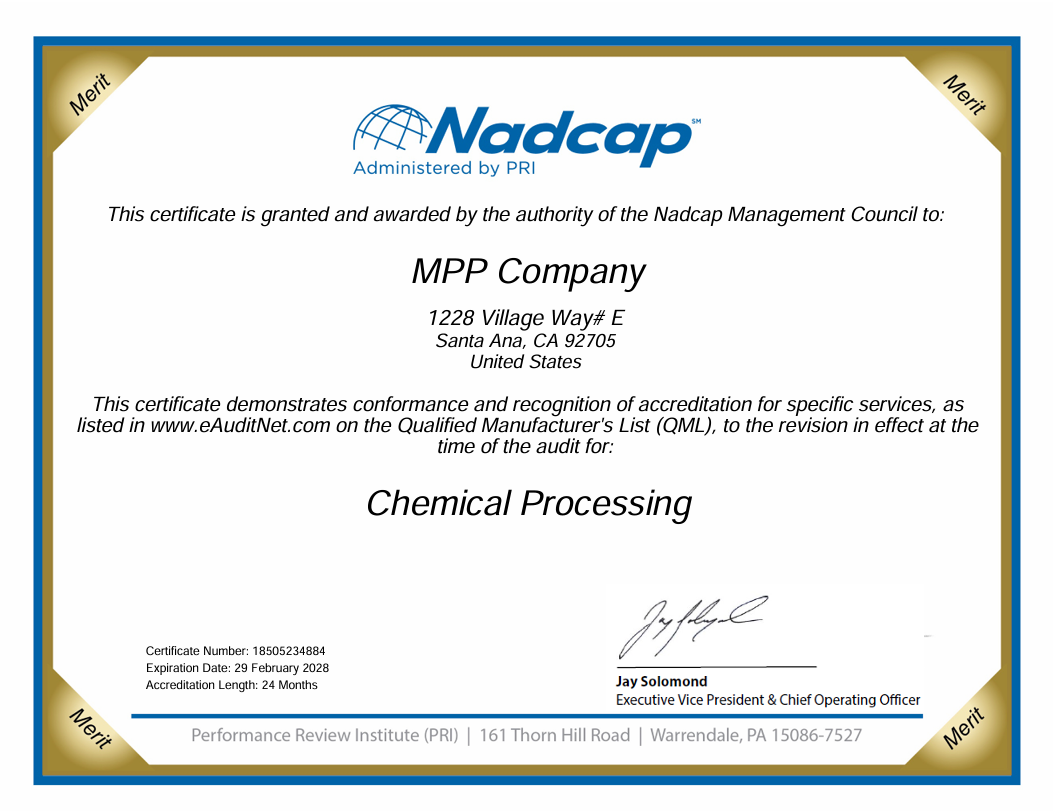 Founded in 1992, MPP Company, Inc. is a service oriented company specializing in high quality metal finishing for the military, aerospace and manufacturing industry. When you work with us, you can reach me, Mike, the owner, about anything at any time. If you have a challenging project, give us a call, we have solved some ridiculously complex problems for customers.